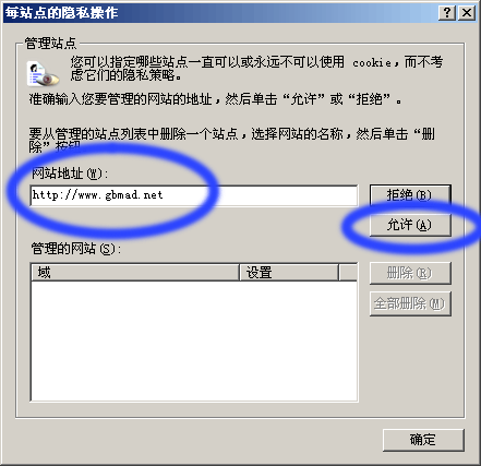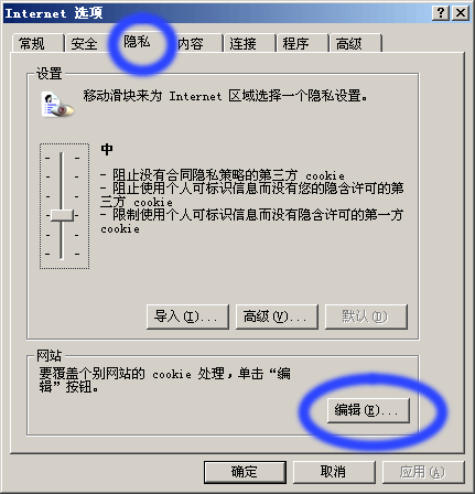 | 问:我的浏览器被设置不能支持Cookies了,我该怎样打开呢? 答:打开你的电脑的 控制面板 找到 Internet 选项 ,如图找到 隐私 选项卡,然后点击编辑,如图所示: ![]() 接着输入社区所在地址:/bbs/,然后点击 允许 按钮即可。如图所示: ![]() 然后就能看到如下图所示的结果,点击 确定 按钮保存设置即可。 ![]() |