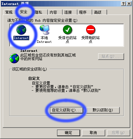 | 问:为什么在左边栏底部我找不到 打开栏 的链接呢?而且看不到密信,在回帖和发送密信时都不能使用快捷键? 答:这是因为你的浏览器被设置为禁用JavaScript,具体设置如下:打开你的电脑的 控制面板 找到 Internet 选项 ,如图找到 安全 选项卡,然后选择 Internet ,接着点击 自定义级别 ![]() 如下图所示,找到 脚本 把脚本下属的三个小项目都选择为启用,接着点 确定 按钮保存设置即可。 ![]() 当然如果你觉得这样影响了你的浏览器的安全,我想你应该知道怎么把社区加入 受信任的站点 吧。 |