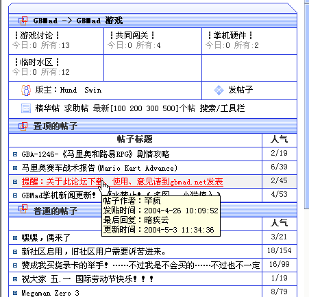 | 问:如何浏览论坛的帖子列表呢? 答:汗,很这个和其他论坛差不多啊,进入论坛后你可以看到左边栏会显示如图的论坛版面列表,会显示版面名称、简介、帖子数等。 ![]() 你这时可以选择分类或详细版面,如上图所示的 GBMad 游戏 就属于分类, 游戏讨论、共同闯关、掌机硬件 等就属于版面,我们先来看看分类吧。 如下图所示:选择分类后可以看到该分类下的所有版面的名称、帖子数、置顶的帖子、普通的帖子(最后50个更新)等,点击版面名称可以进入相应的版面。 点击版主的名字可以该分类的版主发送社区密信,精华帖和求助帖可以查看该分类所有版面的精华帖和求助帖。后面的最新[100 200 300 500]个帖就是查看分类的最新100-500个帖子了。点击 搜索/工具栏 可以打开左边底部的搜索/工具栏窗口,可以进行帖子搜索等操作。 把鼠标悬停在帖子标题上0.5秒后就会显示帖子的作者、发布时间等。帖子标题后面的人气所对应的 2/45 表示该帖子有2个回复,45个人浏览。 ![]() 下图所示是进入相应的帖子版面后显示该版面所有的帖子,和分类相比就是少了分类的版面,其他都是一样,这里就不多说了。 ![]() |