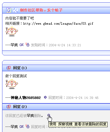 | 问:在帖子正文里那儿可以进行编辑帖子、回复,以及那些小图标是什么意思呢? 答:如下图所示: 表示使用帖子道具,如悬浮陨石、天使翅膀、乱抱树熊等帖子道具。 表示发送密信给用户。 表示查看用户的信息。 表示使用 显影水晶 查看 神秘人物?????? 的真实名称。 表示使用 探察视镜 查看被用户删除的回复等等。上面这些地方鼠标悬0.5秒都能看到提示,另外如点击发贴人的用户名就可进行帖子编辑(当然只能是发贴者自己或者版主有这样的权限),点回复人名称就能进入回复管理。另外如果某条回复被删除则可以点删除者用户名给删除者发送密信。 ![]() |