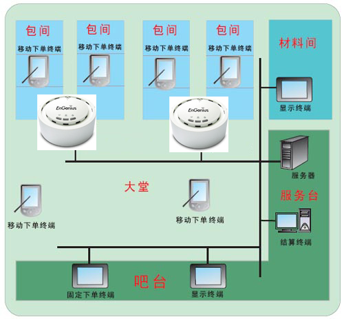 目前很多的高档餐厅都已经实现了电脑管理和点菜系统,而通常的点菜系统都是在每层楼或者一个大的区域放置一个有线